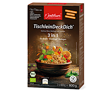 TischleinDeckDich is de heerlijke quinoa gierst maaltijd, afgerond met een schat aan aromatische groenten en kruiden. Door kort te koken, worden de waardevolle ingrediënten optimaal voorbereidt, zodat het organisme zij optimaal gebruiken kan. De hoogwaardige koolhydraten zorgen verder voor een langdurige en gelijkmatige energieverzorging – men komt snel op dreef in het dagelijks leven.